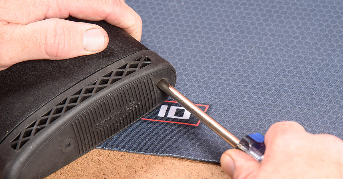 Begin the rear sling mount installation by removing the butt plate. Because the retaining screws are deep inside the rubber butt pad on most shotguns, you will want to use a one-piece screwdriver for this operation. Using a screwdriver with a detachable bit could cause the bit to become stuck in the rubber pad. If that happens, you'll have a not-fun time trying to get it out.